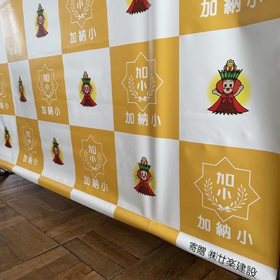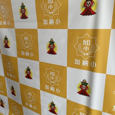 市内の小、中学校全校に、市内の廿楽建設様よりリモート配信する際のバックボード用のシートを寄贈いただきました。加納小学校は、『だいおうまつくん』と校章を交互に配したデザインです。