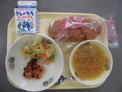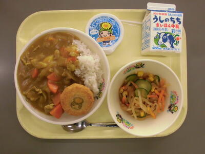 今日は、桶川市市制施行55周年のお祝い給食です。市制施行55周年を皆さんに知ってもらい、思い出に残る給食になるようにと献立を考えました。去年の学校給食アンケートで1位だったカレーライス、おけちゃんの印刷されたポテトコロッケとサイダーゼリーが登場です✨子供達は、「可愛い~」、「おけちゃんがいっぱい!」などと、大喜びしてました。思い出にの残る給食になったと思います😊