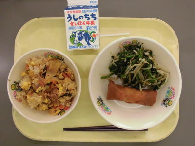 今日は、去年行われた学校給食アンケートでトップ10に入った「磯香あえ」と「キムチチャーハン」の登場です✨キムチチャーハンは、キムチのピリ辛さもありつつ、ご飯と一緒に炊き込むのでうま味が出ます。また、磯香あえは、磯の香りとシャキシャキ食感のほうれん草ともやしを楽しめるあえ物です。人気トップ10入りのメニューの組合せだったので、どのクラスもよく食べていました👍
