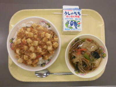今日の「マーボー丼」は、ご飯の上にマーボー豆腐をのせた丼ぶりです。マーボー豆腐とは中国で誕生した料理で、ひき肉に唐辛子🌶やトウバンジャンなどの調味料と豆腐を入れた料理です。給食では、味付にみそやしょうゆ、ピリッと辛さを出すためにトウバンジャンを入れて作りました。ご飯が進む味付けです🍚