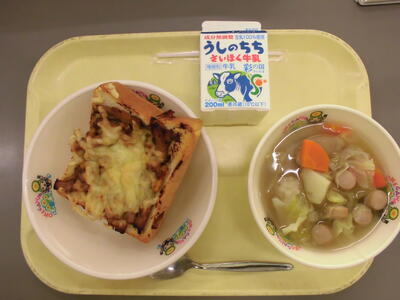 今日は、給食室で一つ一つ手作りするトーストの新メニューになります。今日のトーストは、「てりやきトースト」というもので、照り焼きチキンをイメージしたトーストです🍞醬油、砂糖、みりんなどを合わせたタレで具材を味付けをして、チーズをトッピングして焼きました🧀照り焼きは、調味料を合わせて焼くことで「照り」がうまれることから、このような名前が付いたそうです。照り焼き味を楽しんでみてください!